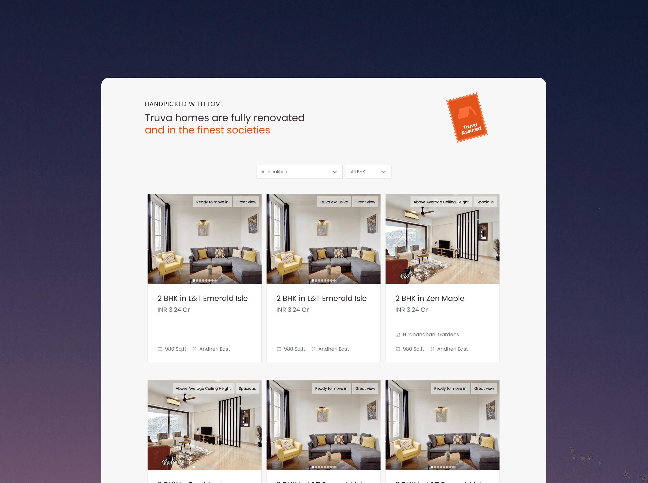 The page introduces TRUVA’s curated home-buying experience, showcasing handpicked, renovated homes with clear pricing and verified details. It combines property discovery with explanations of TRUVA’s process, helping buyers explore homes while building trust in the platform.